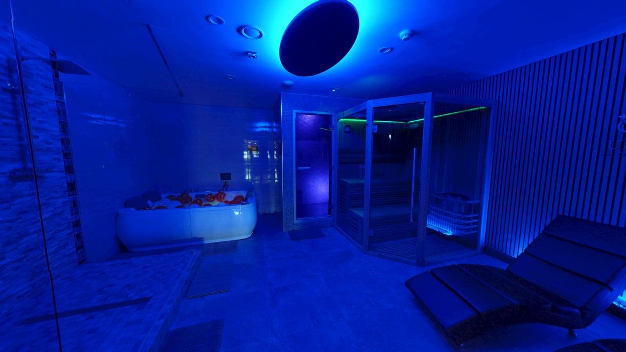 Our Unique Hot Tub Room is designed for up to 8 people and features a large Hot Tub, large steam room, large dry sauna, double size shower and comfortable seats to relax and enjoy a glass or two of bubbly during your visit.